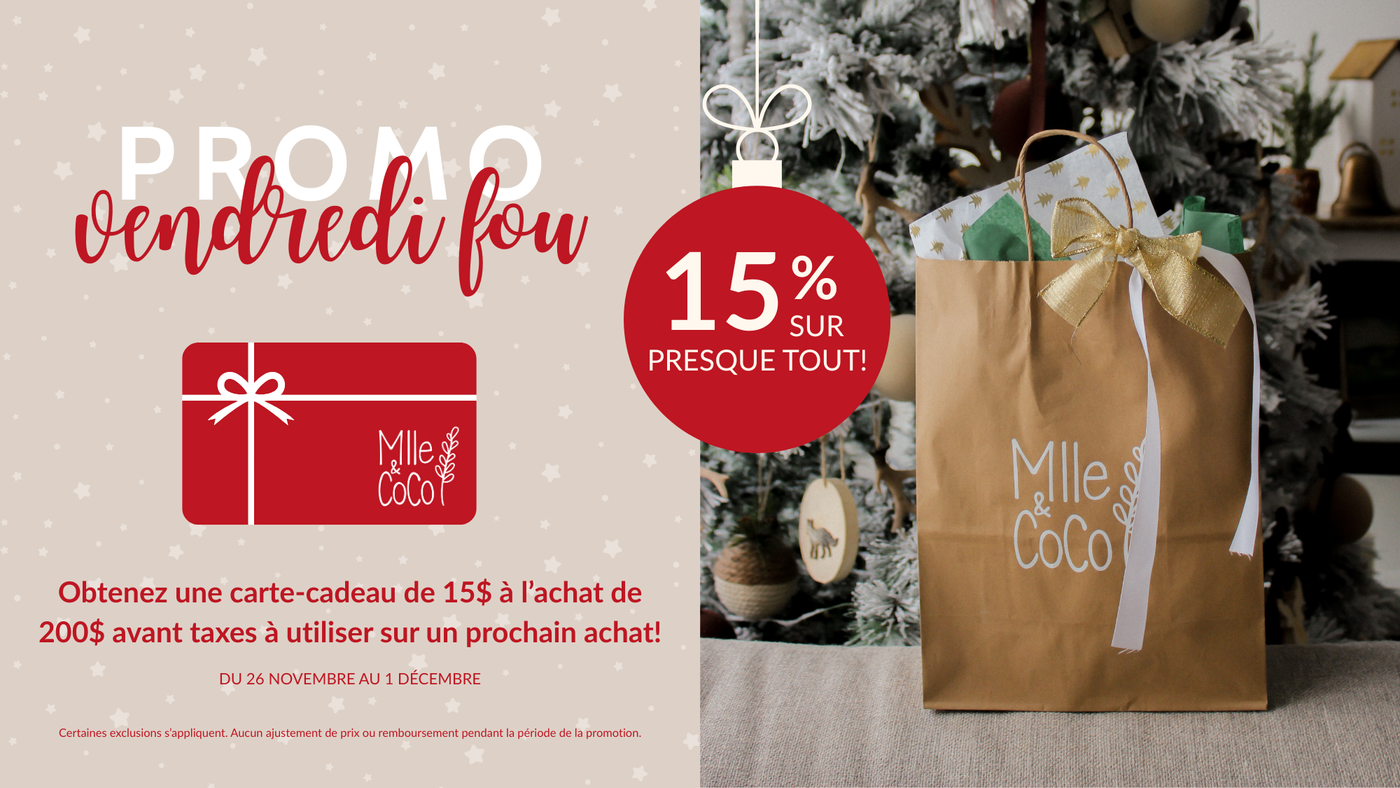 PROMO VENDREDI FOU: 15% DE RABAIS SUR PRESQUE TOUT + 15$ EN CARTE CADEAU À L'ACHAT DE 200$
