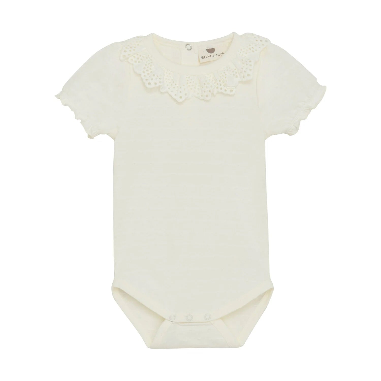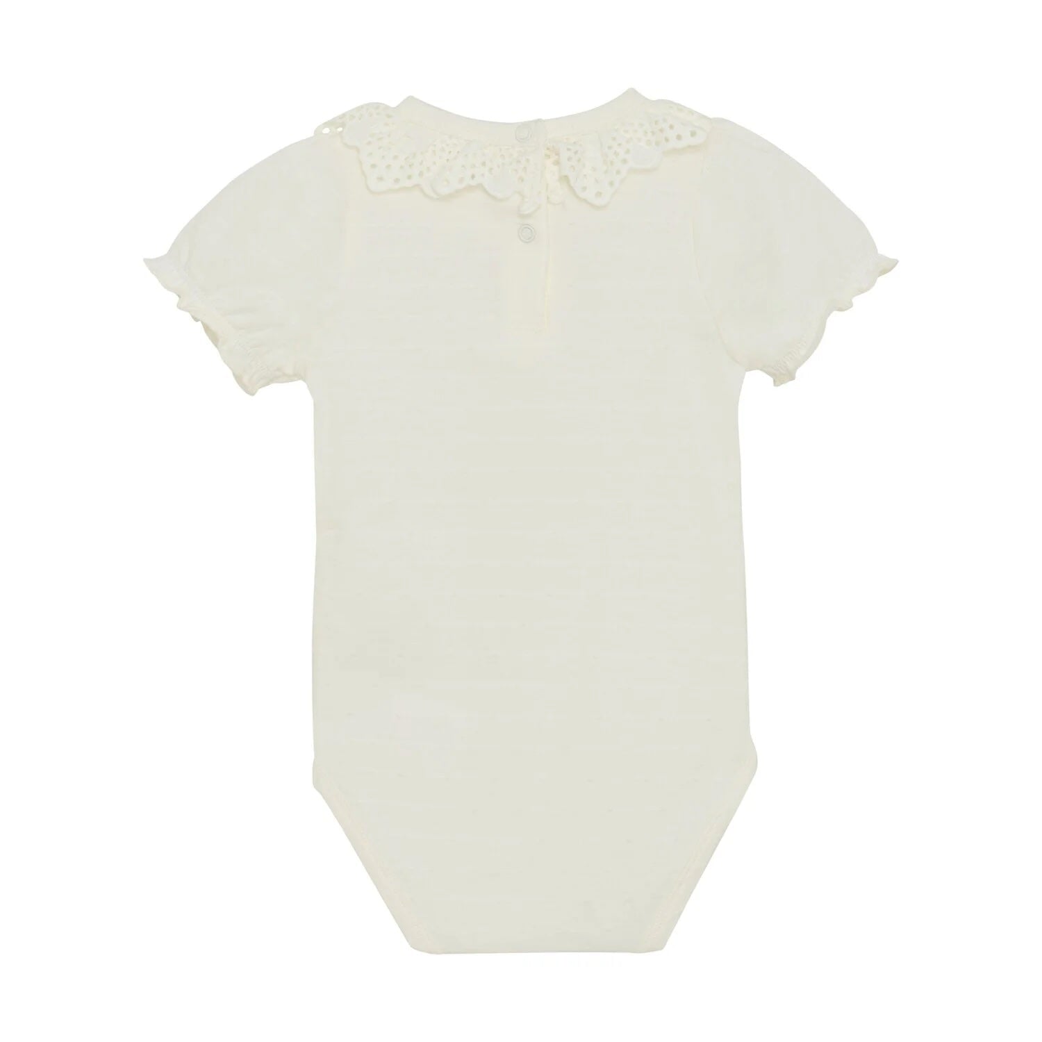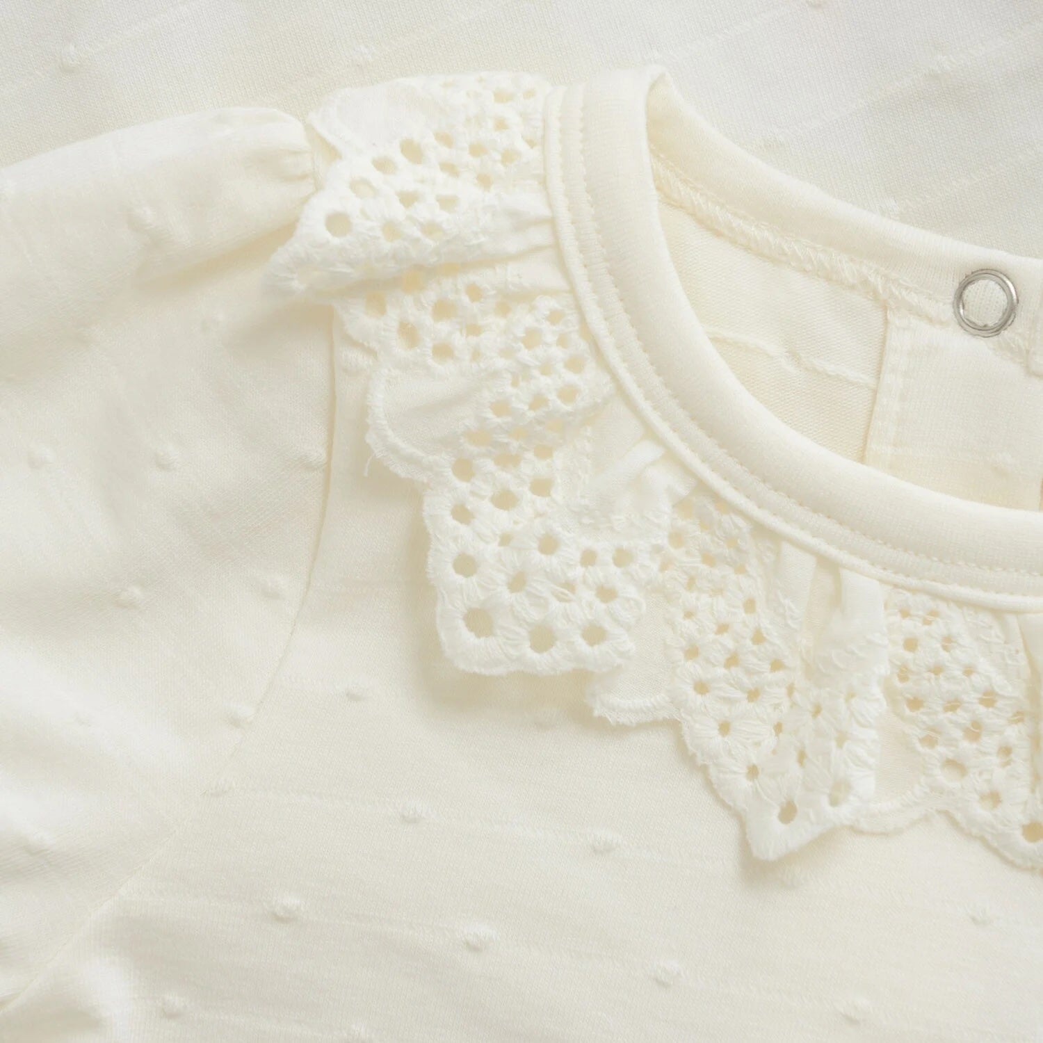Adorables cache-canapés en dentelle ivoire. Conçu à 95% de coton biologique, il est doux, respirant et agréable à porter pour la peau sensible de bébé. Ses manches bouffantes et ses jolis détails en font une pièce à la fois pratique et élégante pour le quotidien.
