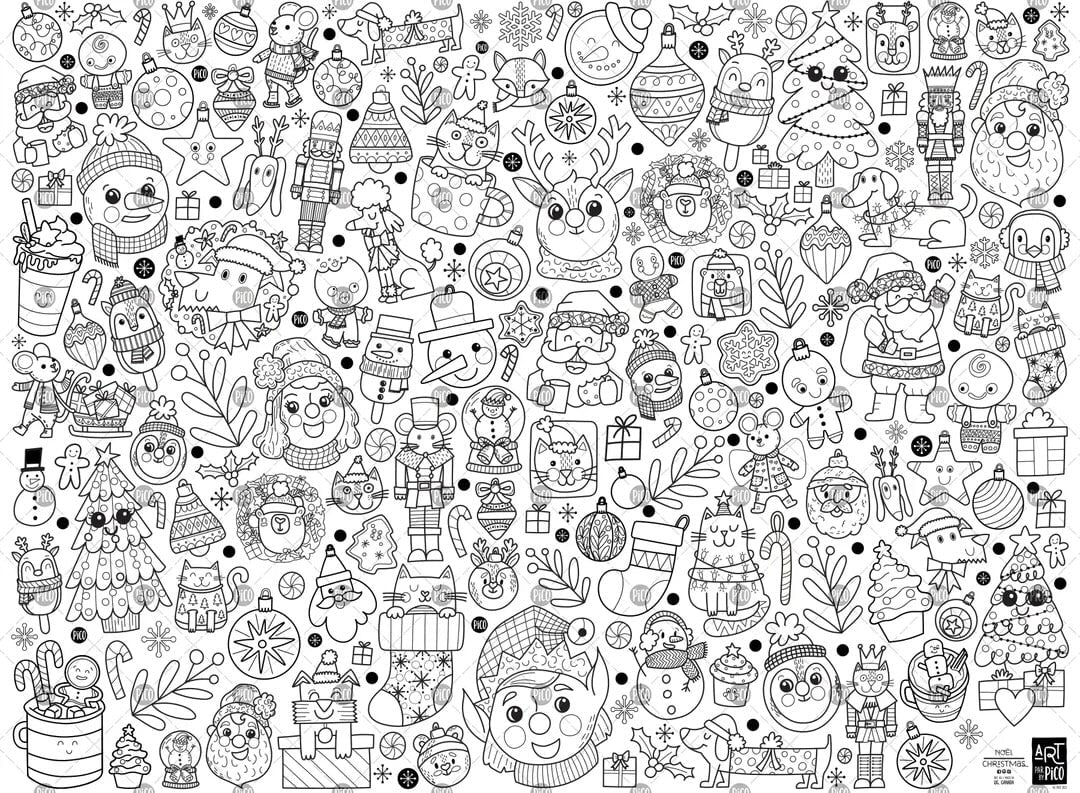 Plongez dans la magie des fêtes avec cette affiche géante de Noël à colorier, remplie de détails : animaux festifs, décorations, personnages de Noël et gourmandises. Elle séduira petits et grands et peut servir à décorer la maison, la classe, ou même comme nappe ou décor photo pour le réveillon.