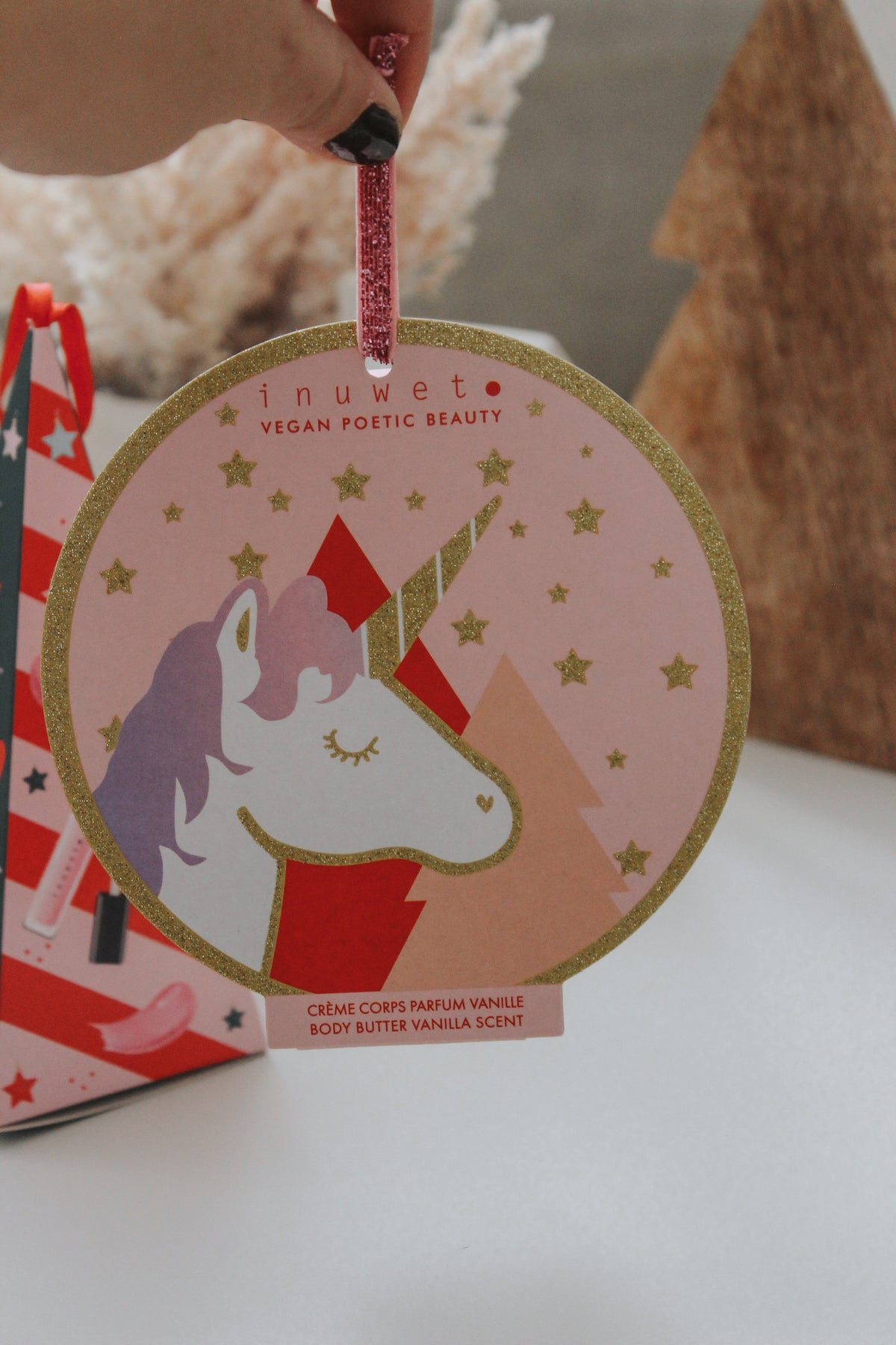 Superbe ornement licorne de Inuwet. Parfait pour ajouter une petite surprise dans le sapin, le coffret contient une crème de corps à senteur de vanille. Le produit est végan et adapté aux enfants de 3 ans et +. Une petite idée qui ajoutera certainement un peu de magie au temps des fêtes.