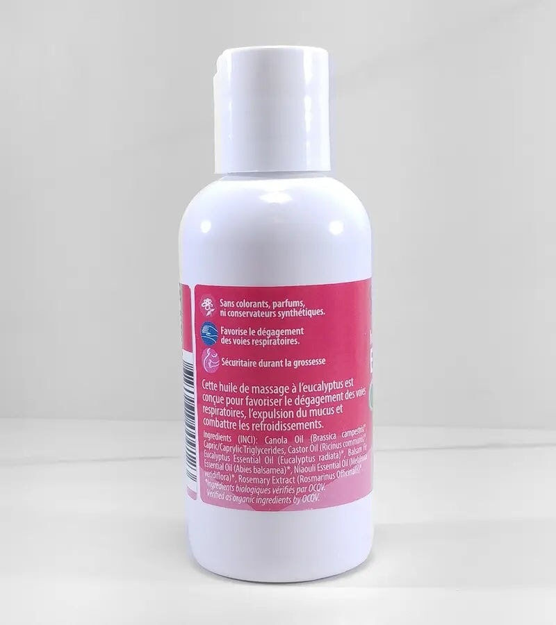 Pour enfant de moins de 6 mois, mélanger 1 partie d’Huile à l’eucalyptus BIO avec 1 partie d’Huile de massage à la calendula BIO.