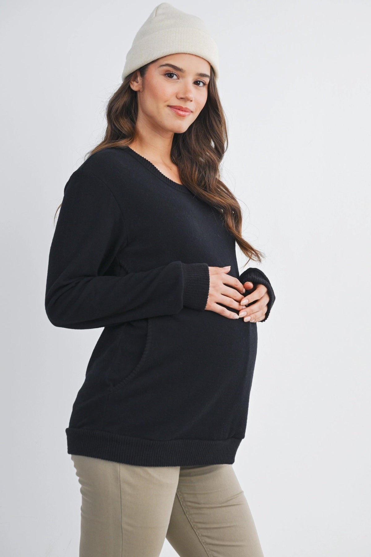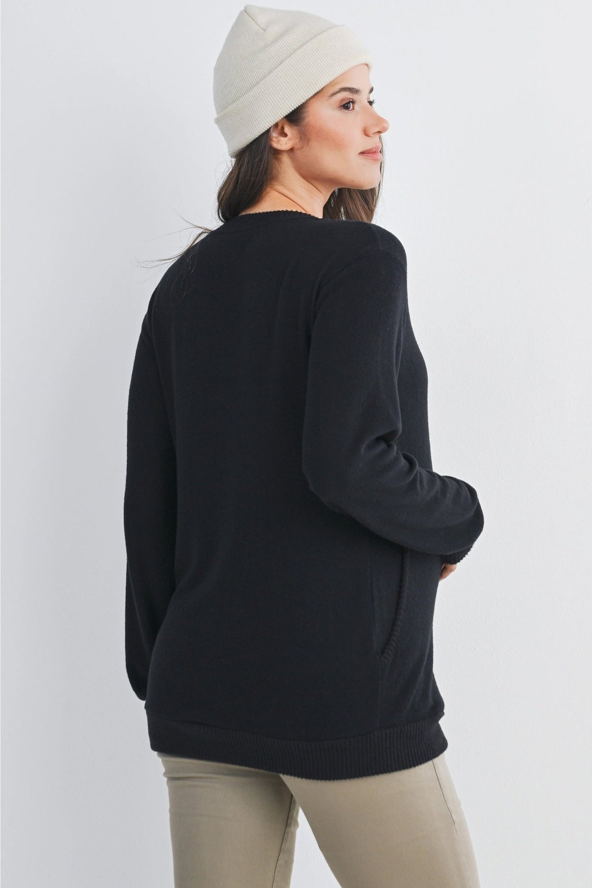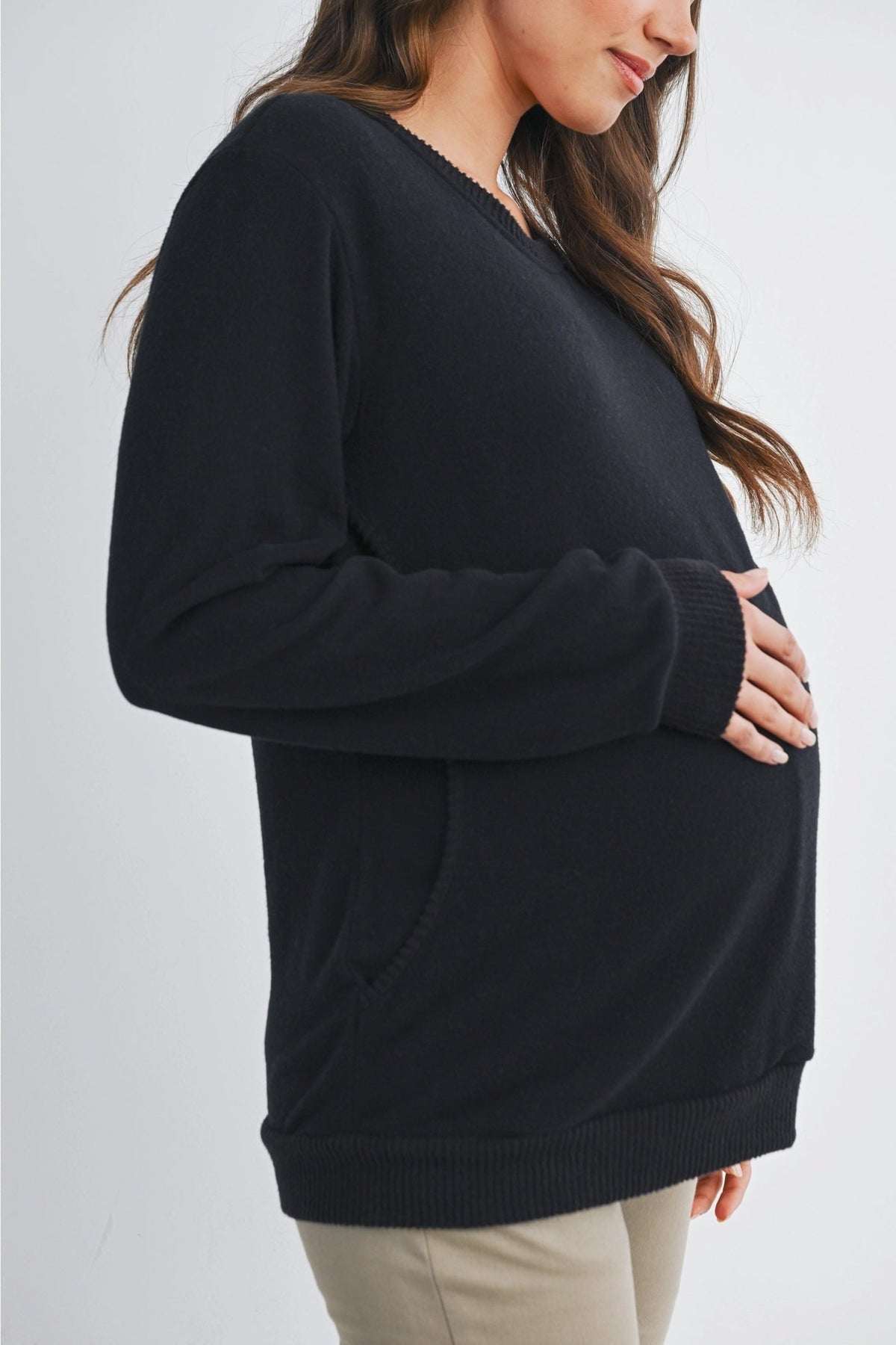 Ce pull doux et extensible est pensé pour accompagner la grossesse et la maternité. Ses manches longues, son col en V à double couche et ses poches latérales en font une pièce pratique et confortable du quotidien. Grâce à son ouverture discrète, il est aussi conçu pour faciliter l’allaitement en toute simplicité.