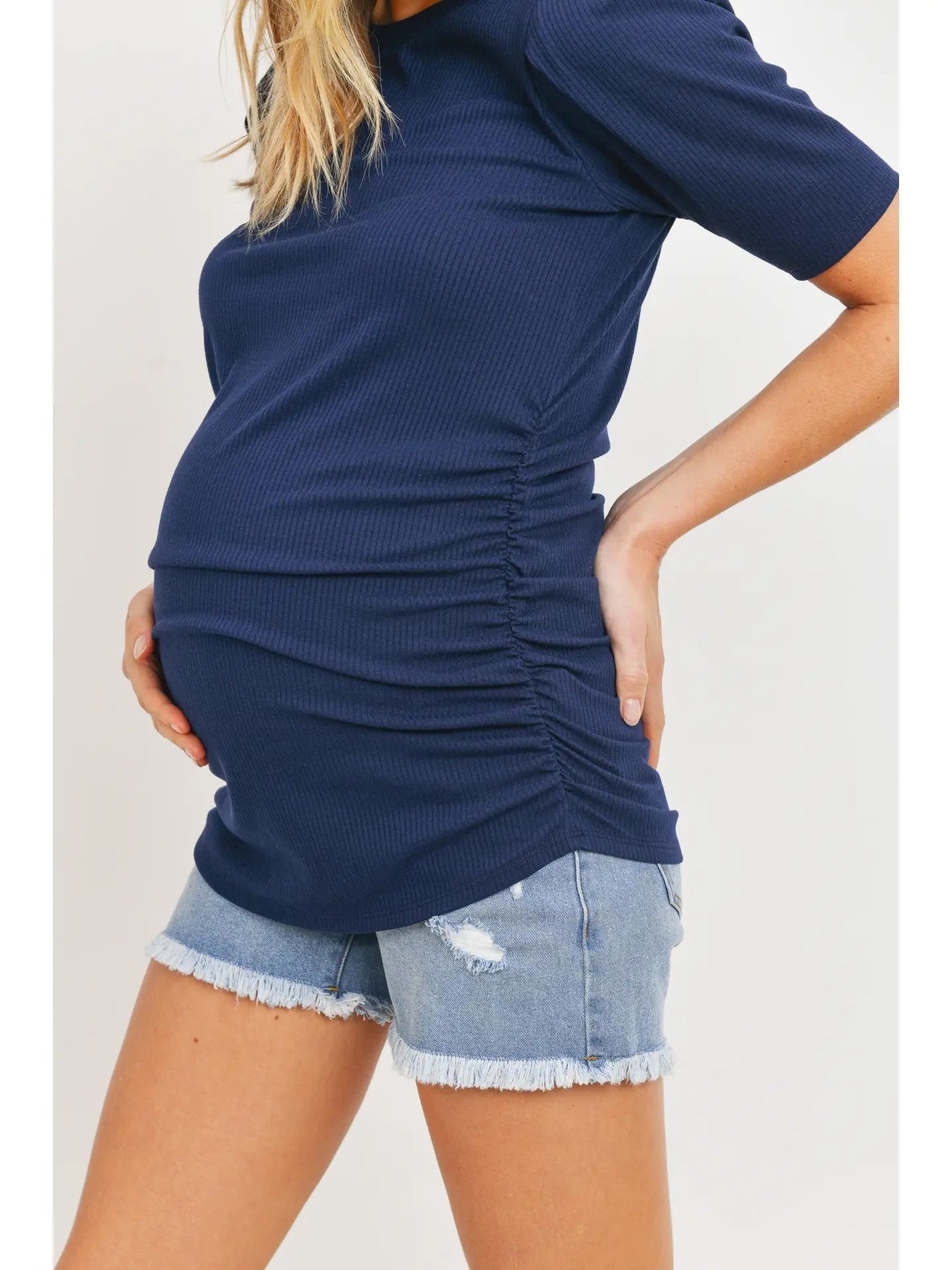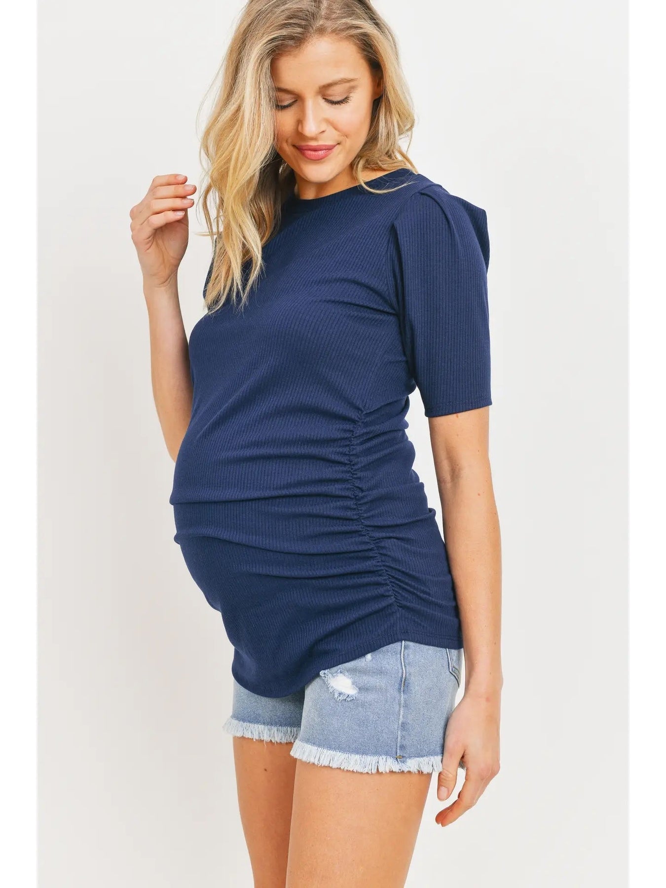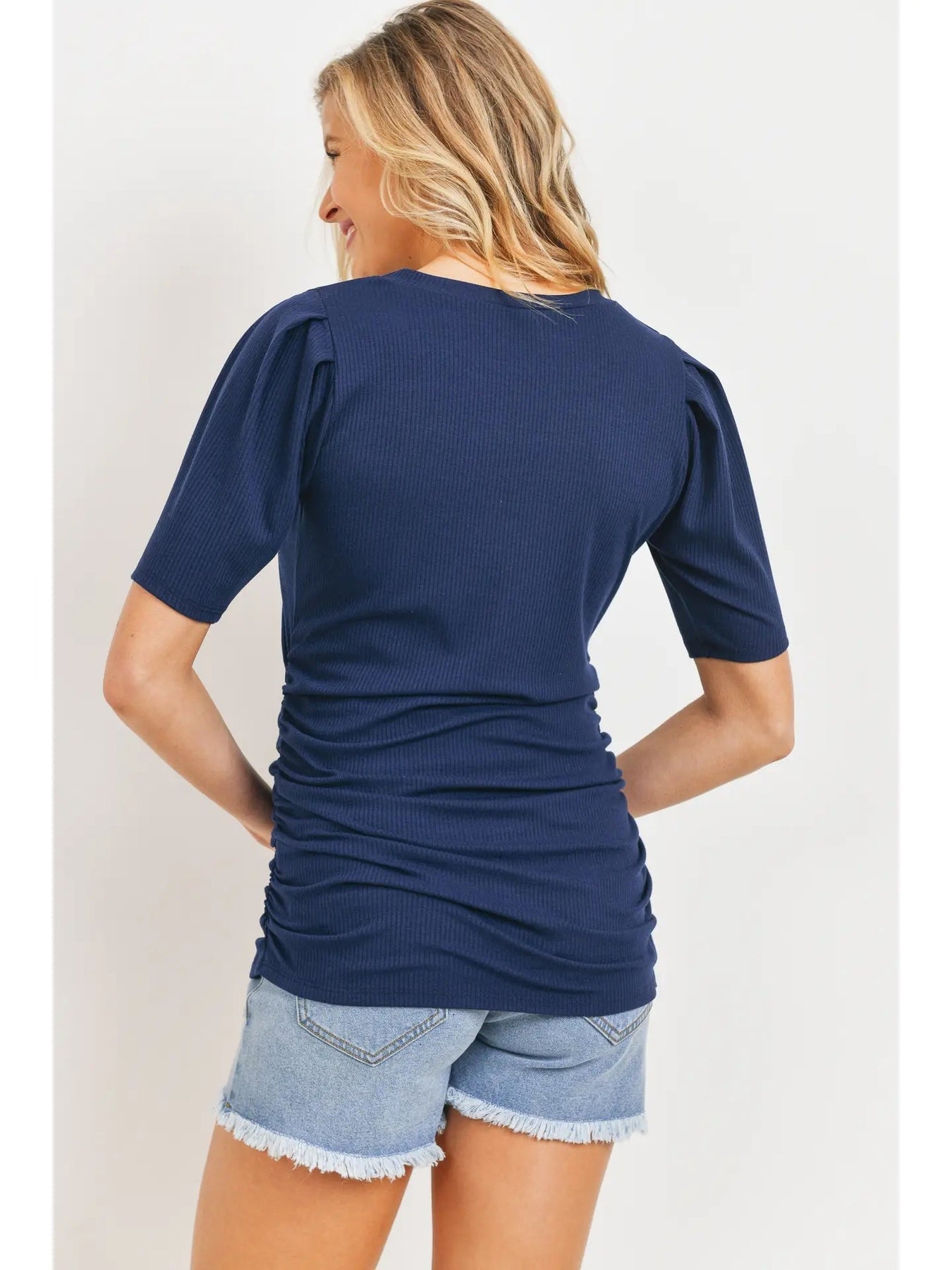 Haut de maternité froncé en tricot côtelé à manches courtes, doté d’un col rond, de manches bouffantes et d’un tissu côtelé extensible. Les fronces latérales offrent une coupe ajustée et flatteuse qui évolue avec la grossesse.