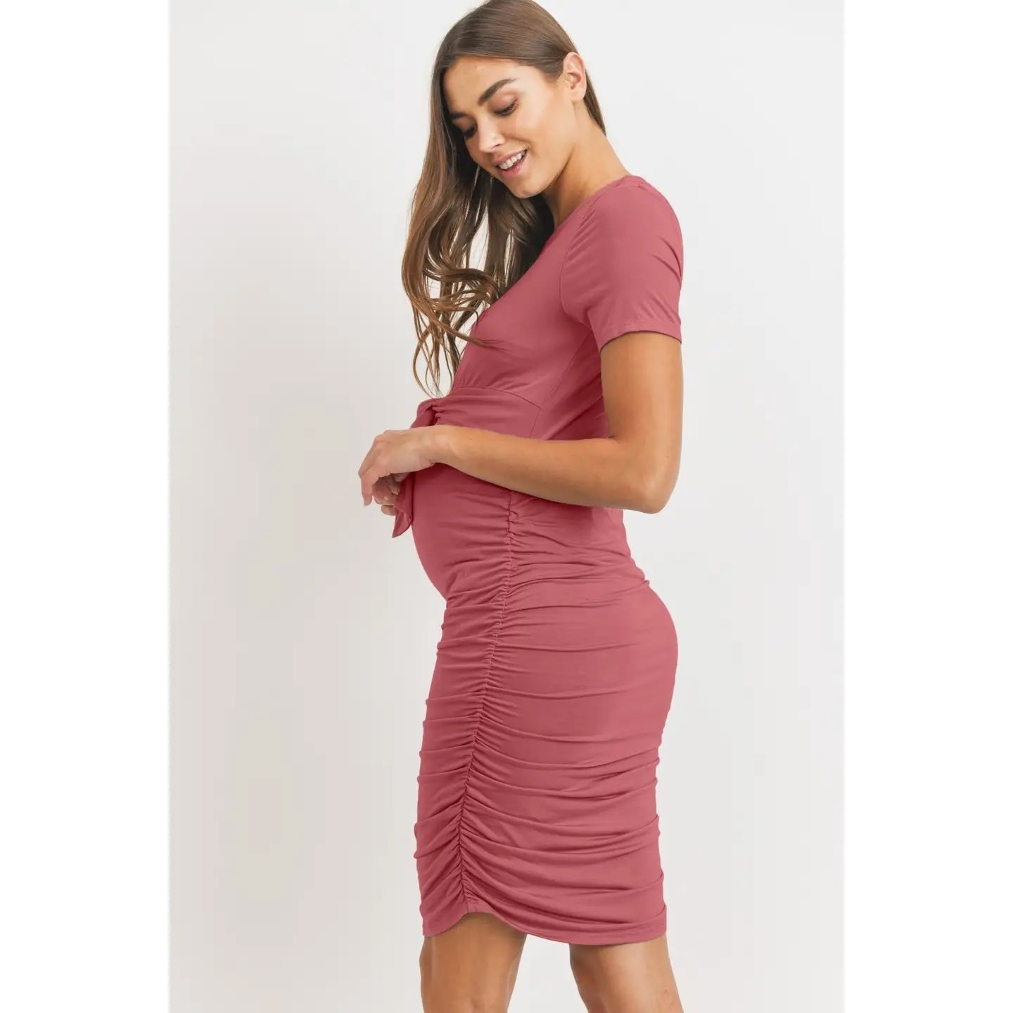 Robe de maternité Hello Miz. Son tissu doux et souple vous offrira tout le confort désiré pendant votre grossesse. Le petit noeud à l'avant de la robe mettra en valeur votre joli ventre grandissant.