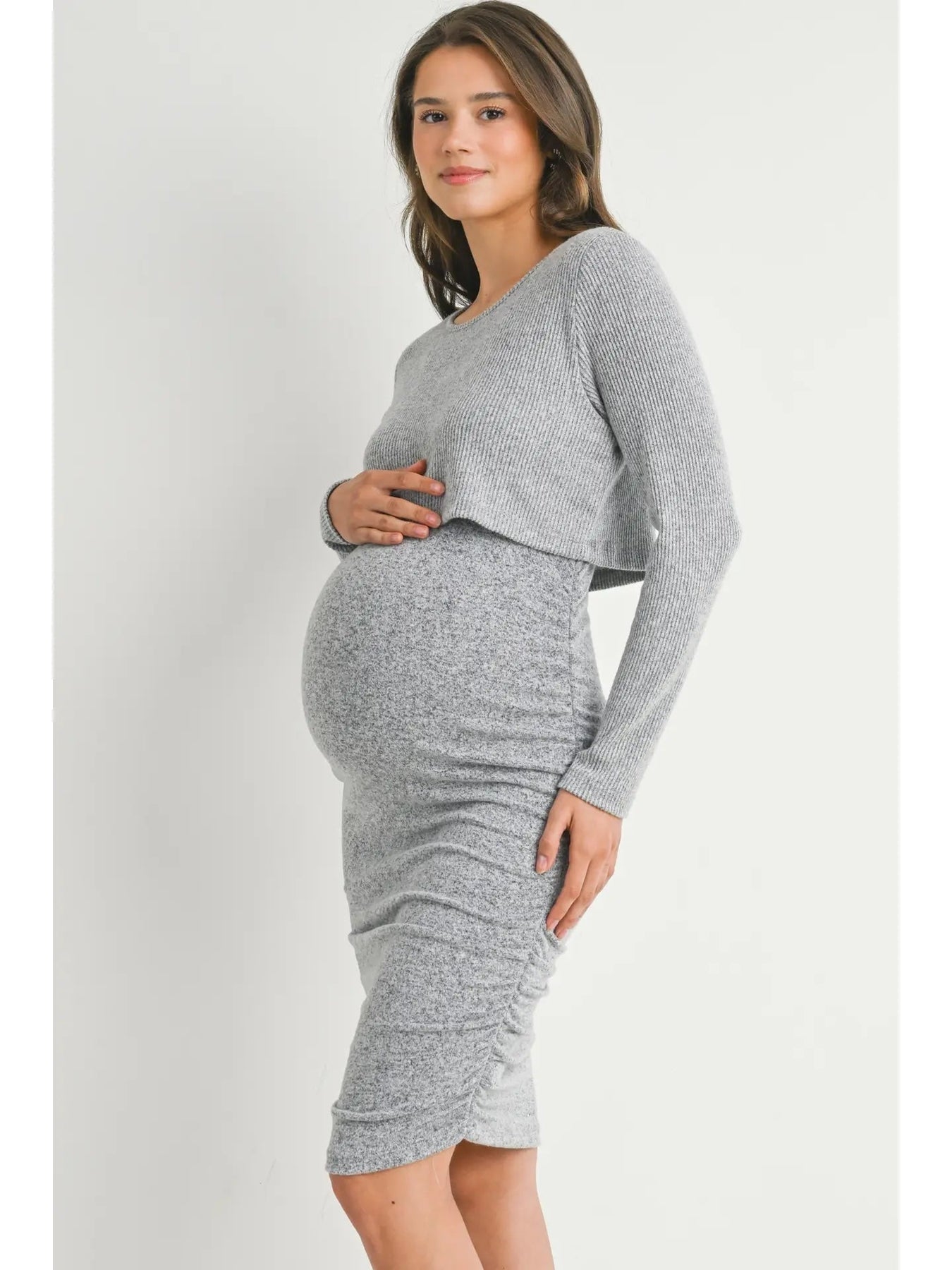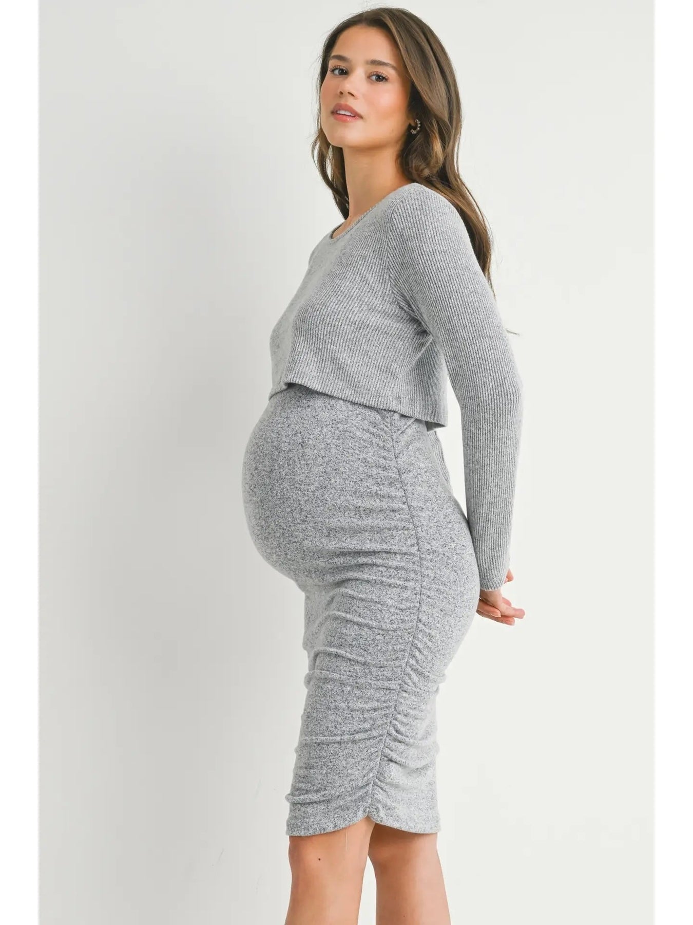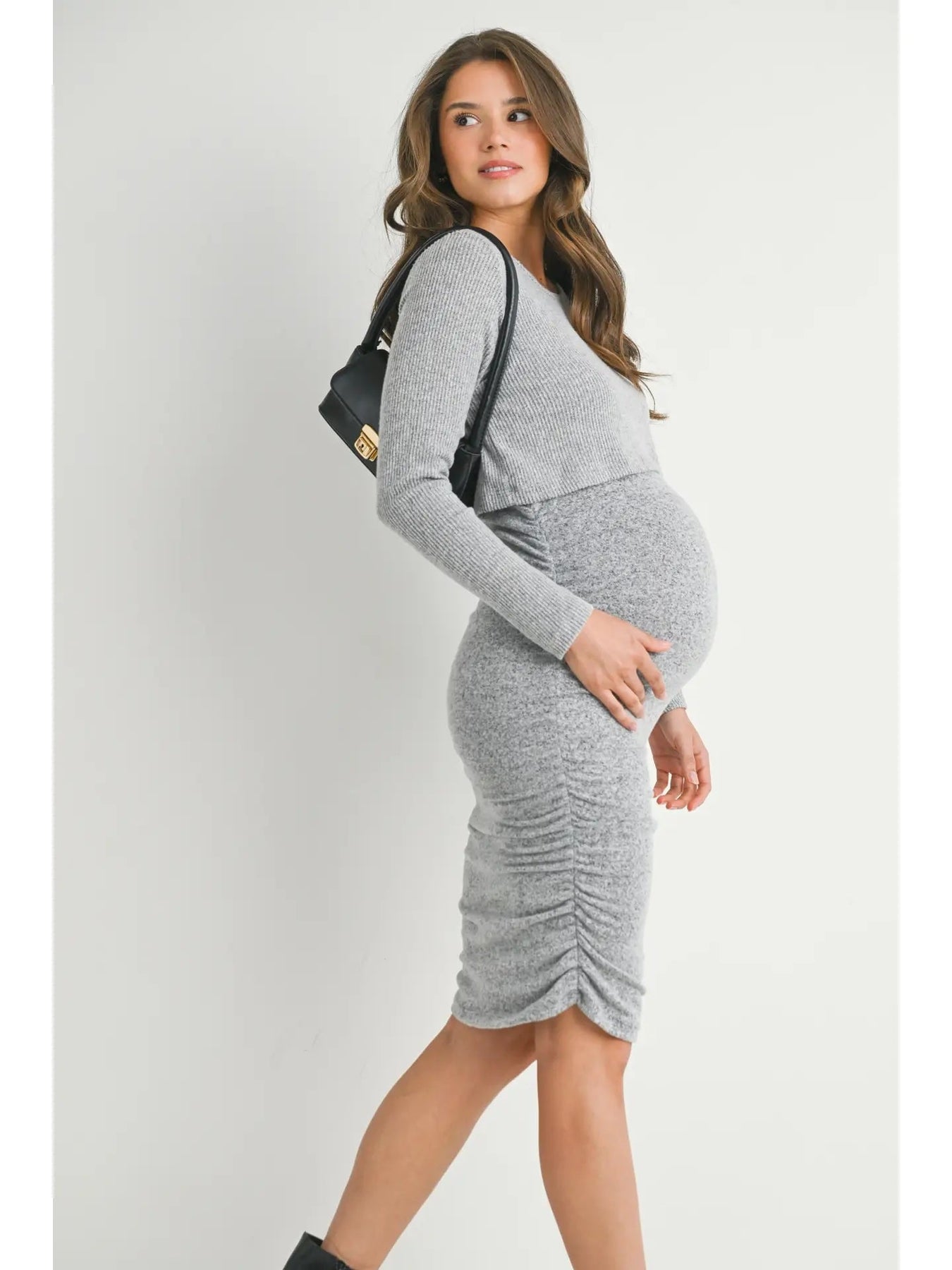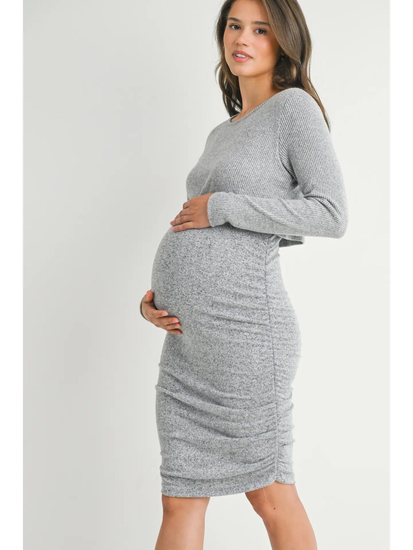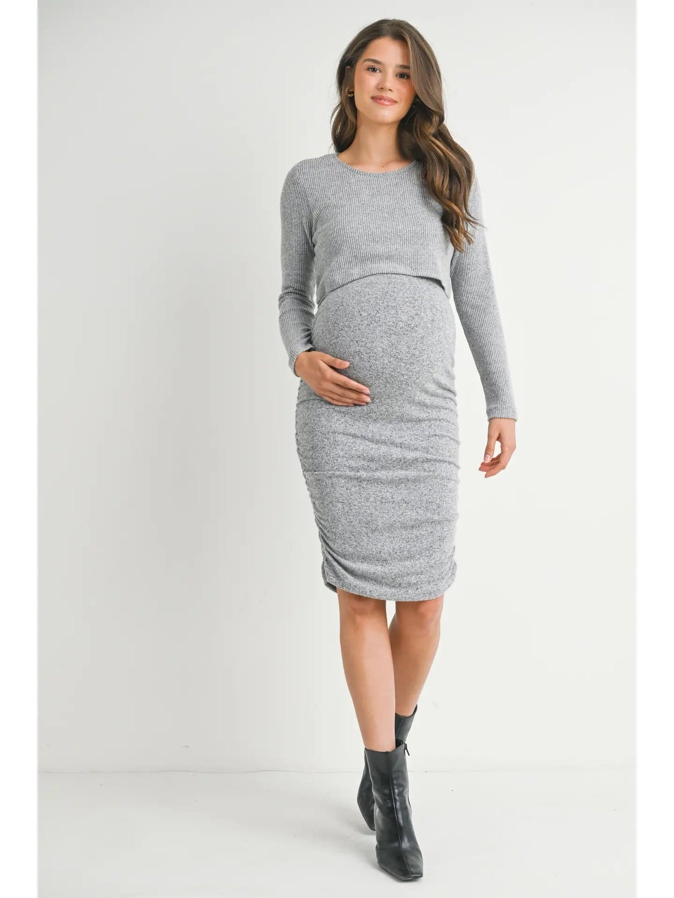 Robe de maternité et d’allaitement en tricot Hacci côtelé, à manches longues et double épaisseur. Sa coupe froncée met la silhouette en valeur tout en offrant confort et extensibilité tout au long de la grossesse.