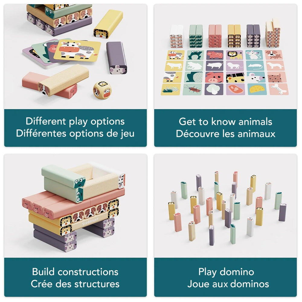 Les enfants construisent une grande tour en empilant les blocs de bois colorés ornés de jolis motifs d’animaux. Puis, le défi commence ! À tour de rôle, ils lancent le dé ou pigent une carte pour identifier un animal. Il faut alors retirer délicatement le bloc correspondant et le replacer au sommet… sans faire tomber la tour ! Si elle s’effondre, il faut tout recommencer.