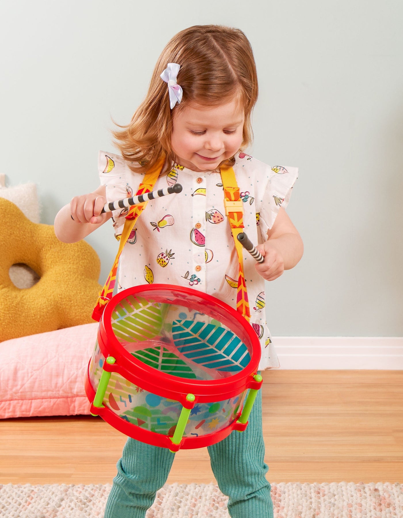 Facile à transporter, cet ensemble est parfait pour jouer partout et à tout moment. Tous les instruments se rangent directement à l’intérieur du tambour, et sa sangle pratique sert aussi de poignée pour l’emporter partout.
