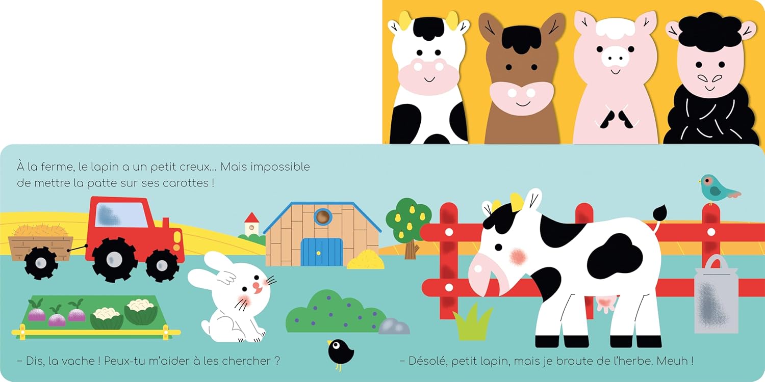 Ce livre interactif invite l’enfant à participer à l’histoire grâce à quatre marionnettes à doigts en feutrine toute douce : une vache, un cheval, un cochon et un mouton. Page après page, le jeu prend vie et stimule l’imagination.