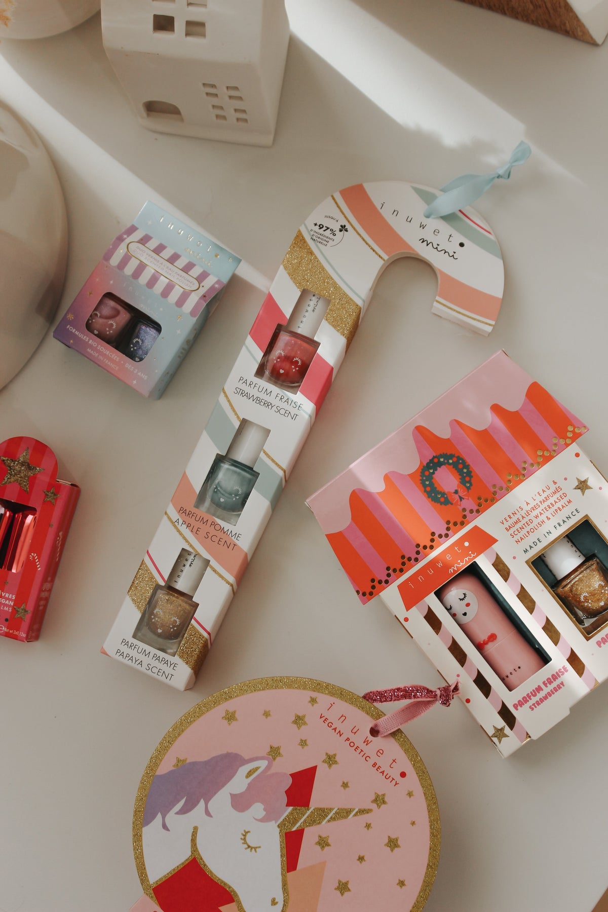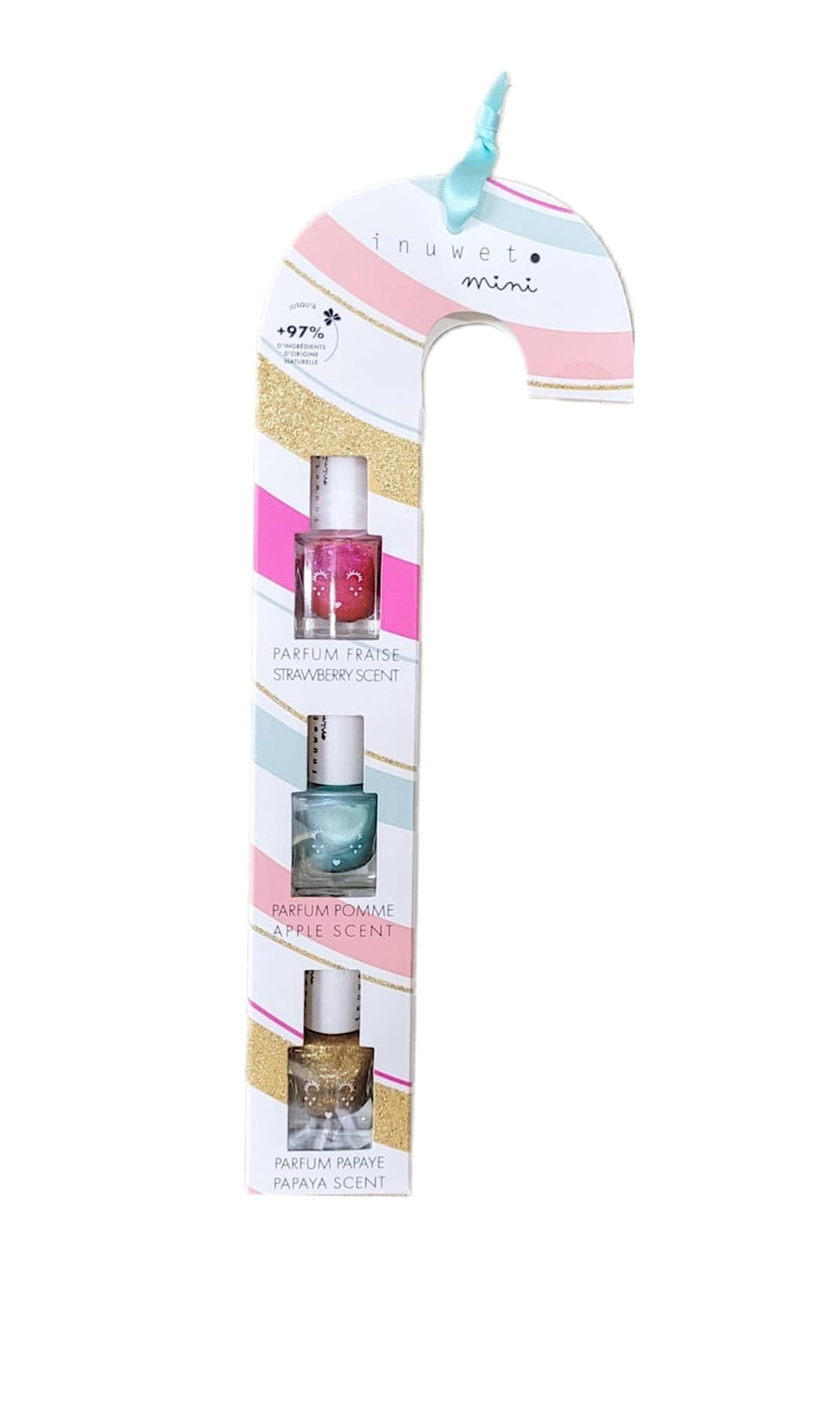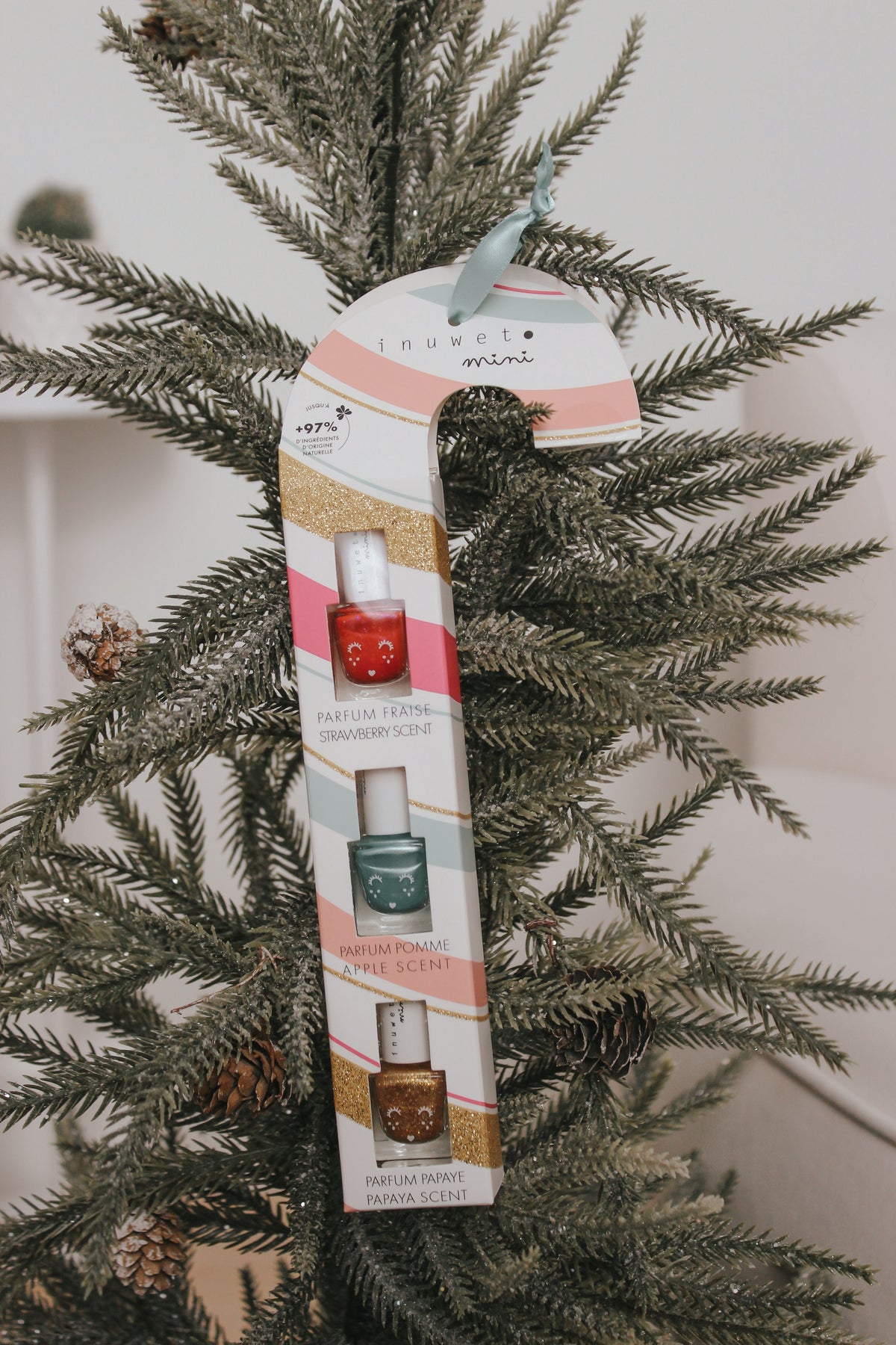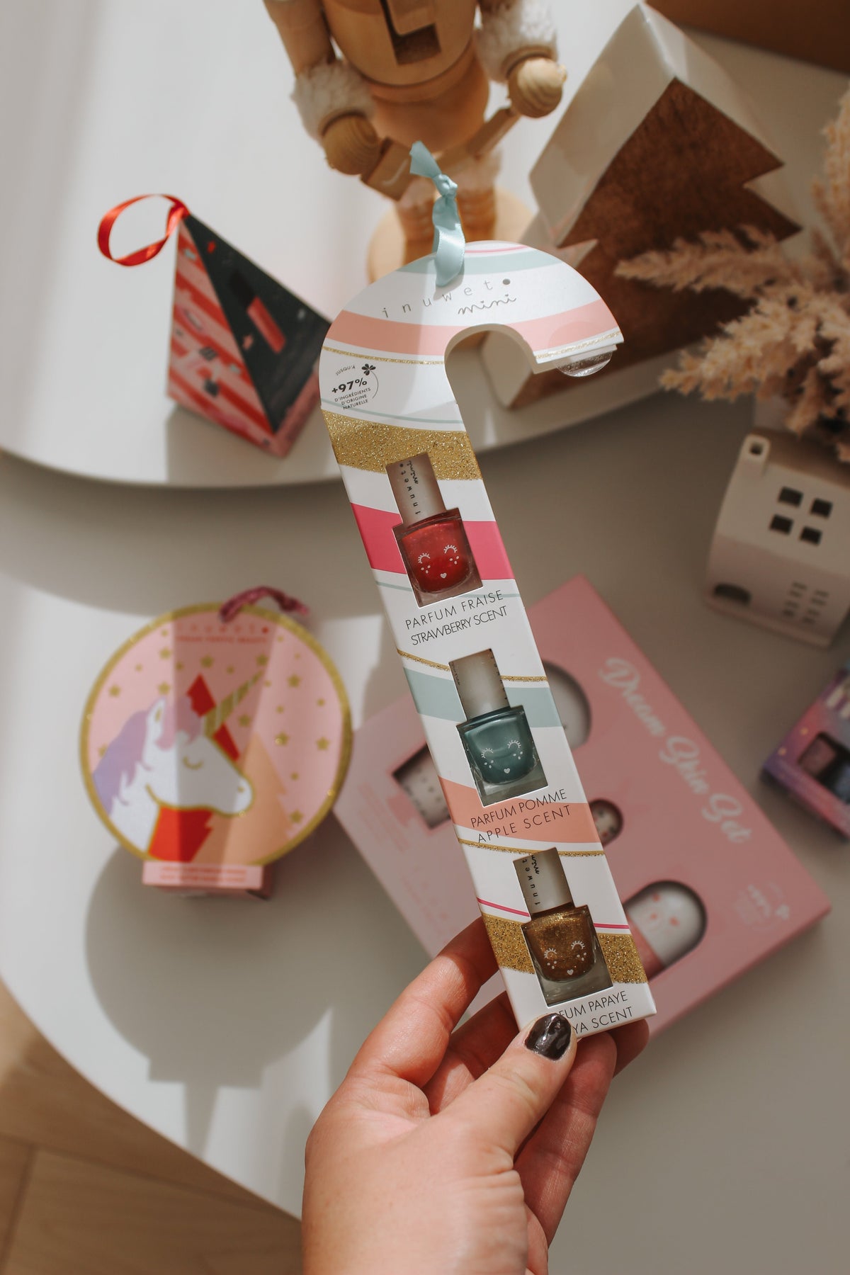 Ajoutez une touche de magie sous le sapin avec cet ensemble de 3 vernis à ongles véganes de Inuwet, joliment présenté dans un emballage en forme de canne festive !