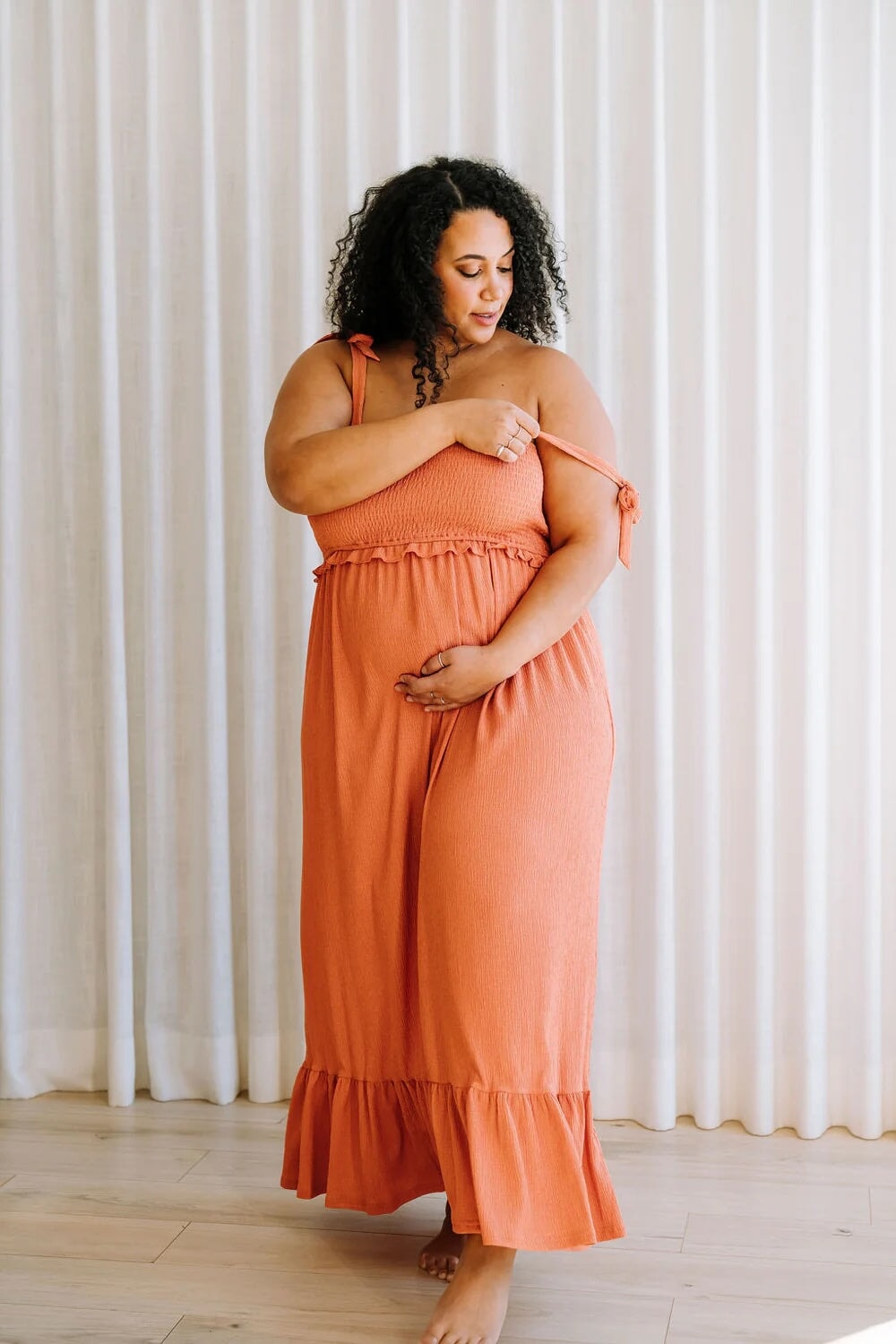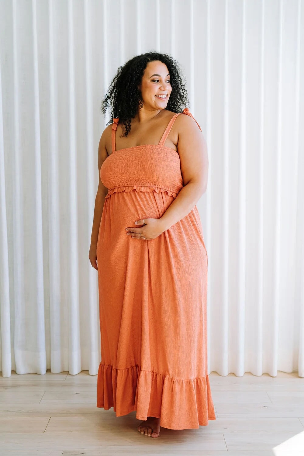 Son tissu extensible épouse délicatement la silhouette, tandis que le détail nid d’abeille au buste ajoute une touche de texture et de confort. Grâce à ses bretelles ajustables, elle permet également un accès facile pour l’allaitement, ce qui en fait une option pratique et raffinée pour les nouvelles mamans.