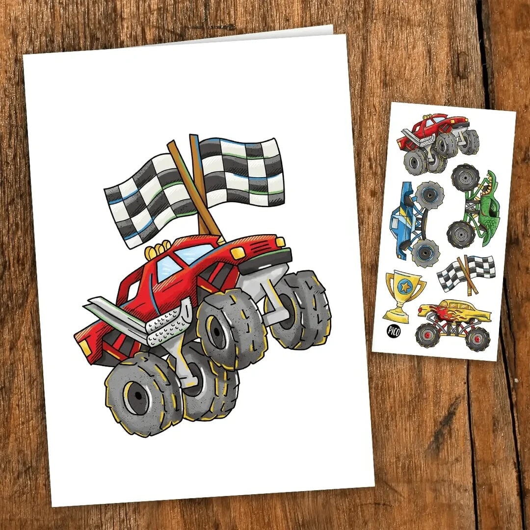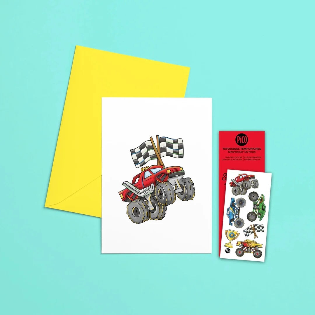 Vous connaissez un(e) fan de camions monstres ? Offrez-lui la carte d’anniversaire parfaite ! Elle inclut une feuille de tatouages des camions monstres et une enveloppe jaune.