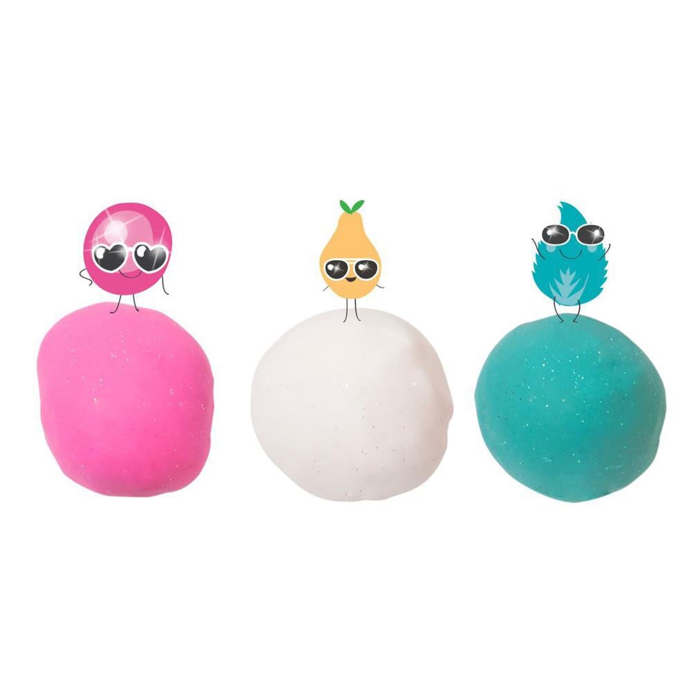 Trois pots de pâte à modeler scintillante, souple et malléable, facile à manipuler.