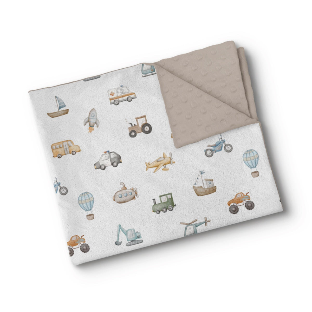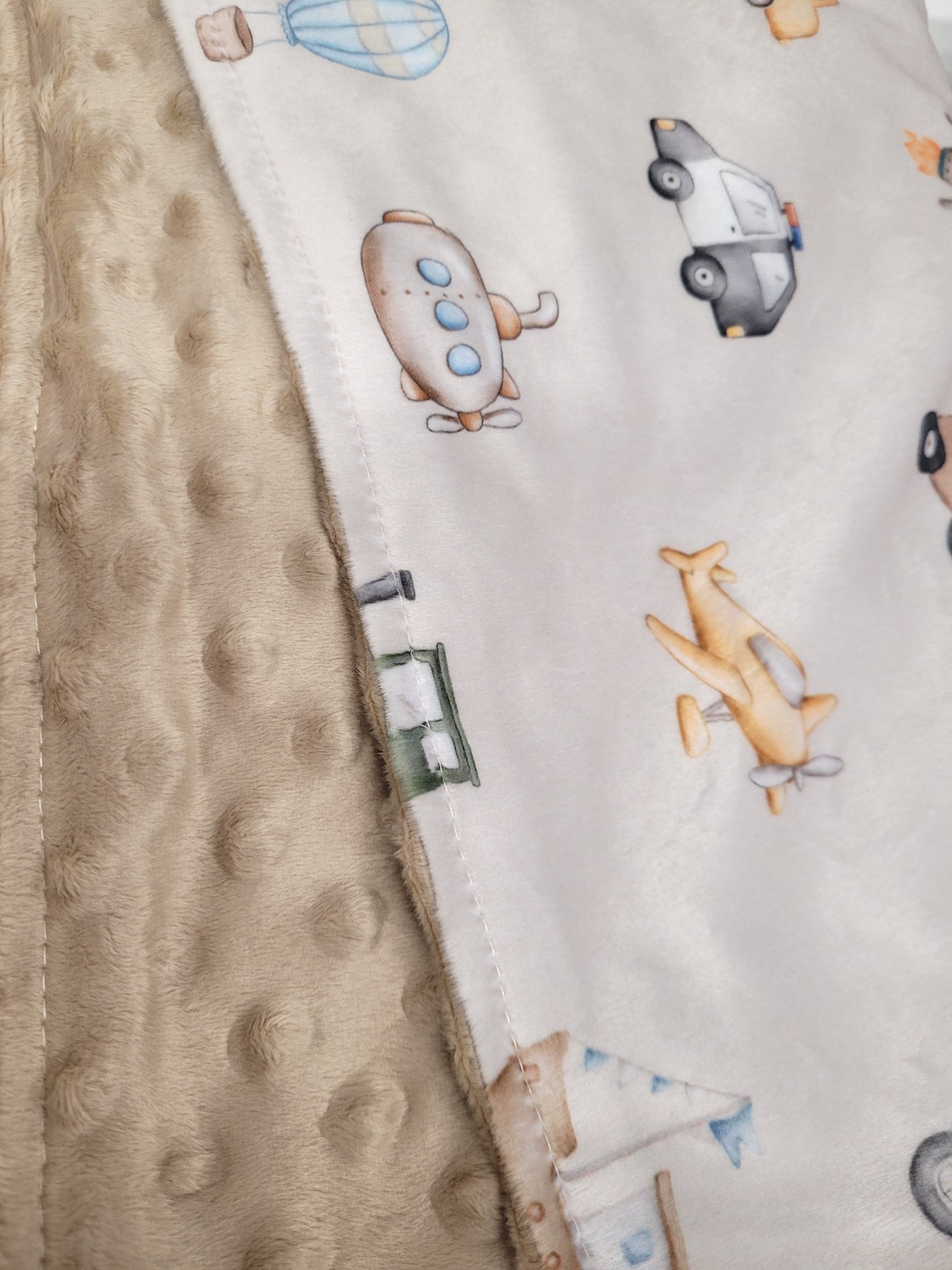 Large all-minky blanket, patterned on one side and plain minky dot on the other (beige).