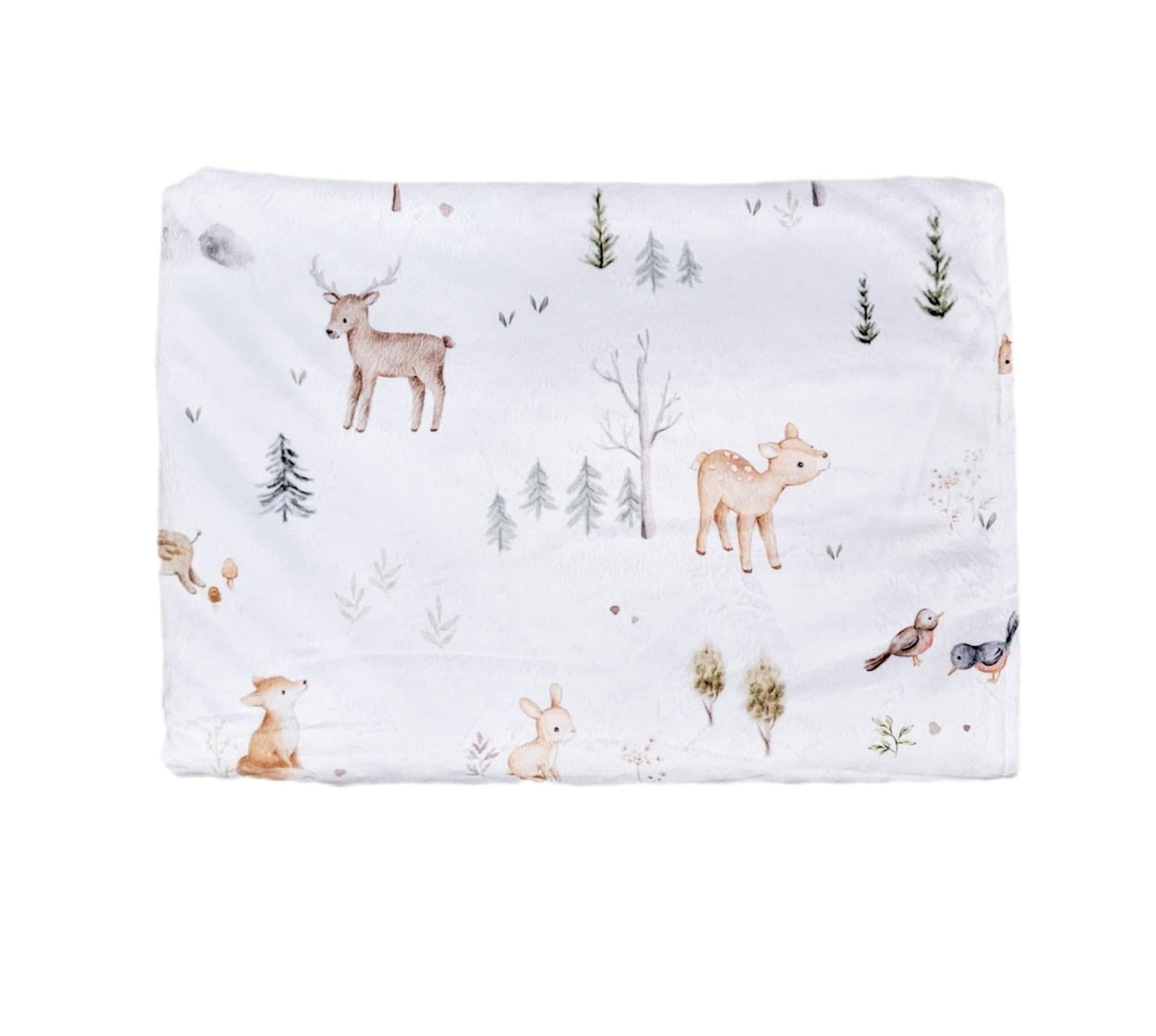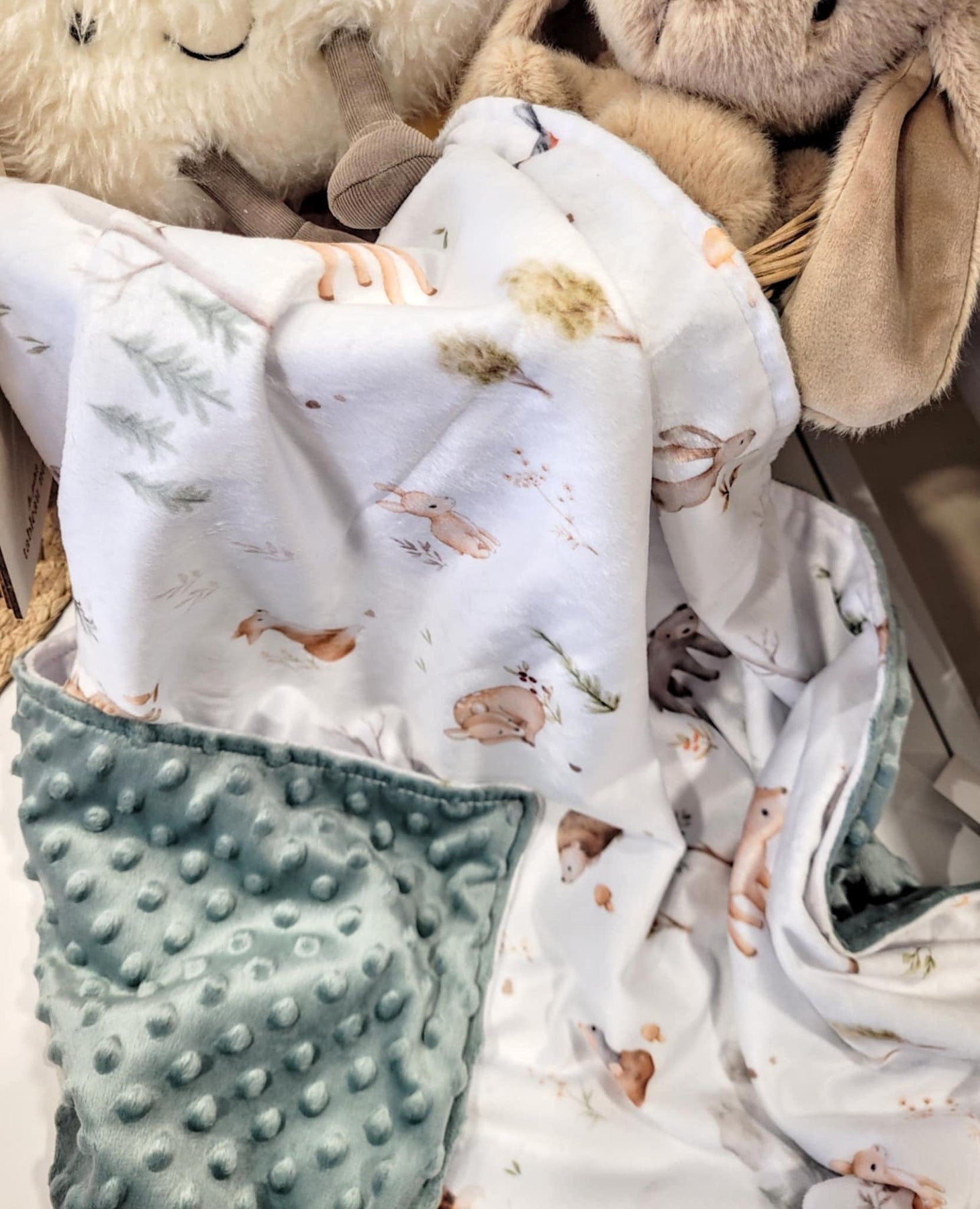 Grande couverture tout en minky. Entièrement en minky à motif d'un côté et en minky dot uni de l'autre.
