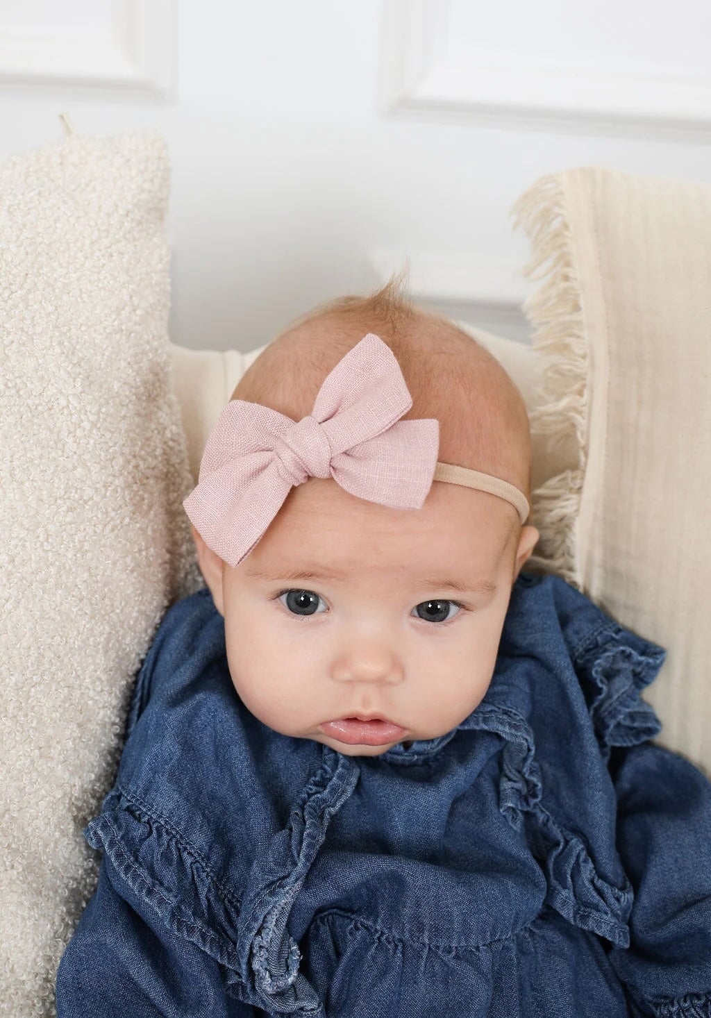Ensemble de deux jolies mini-boucles en lin, montées sur un bandeau en coton. Parfait pour les bébés, tout-petits et petites filles.