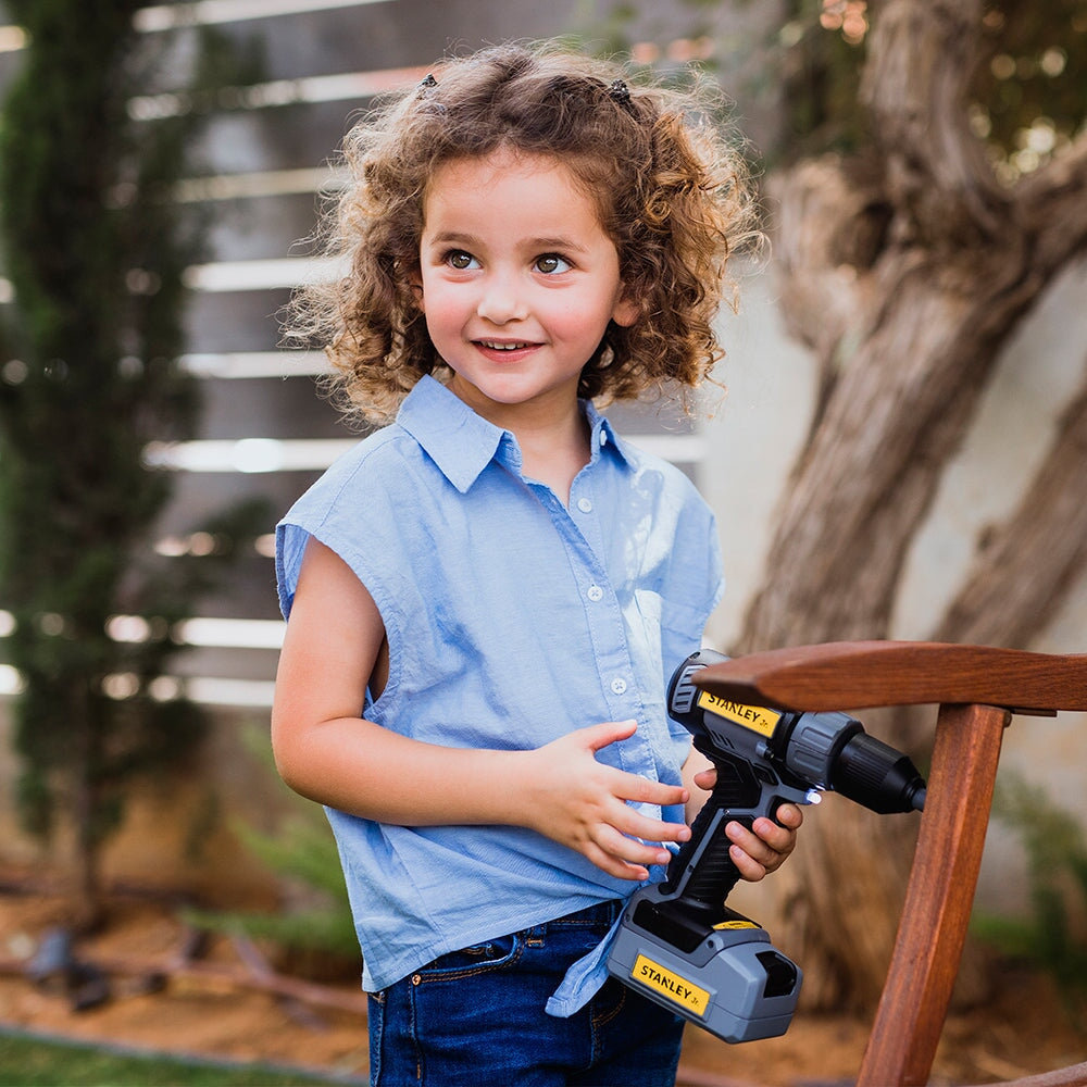The Stanley Jr. Power Drill is a battery-powered drill designed to give young builders a safe and realistic building experience. This kids' power drill includes three interchangeable bits, authentic sounds, lights, and movements for a safe, hands-free DIY experience.