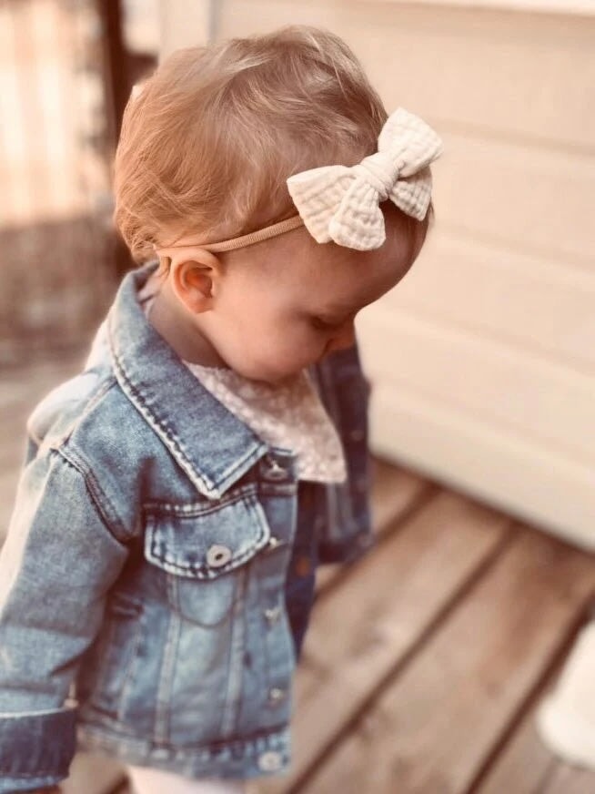 Ensemble de deux jolies mini-boucles en mousseline, montées sur un bandeau en coton. Parfait pour les bébés, tout-petits et petites filles.