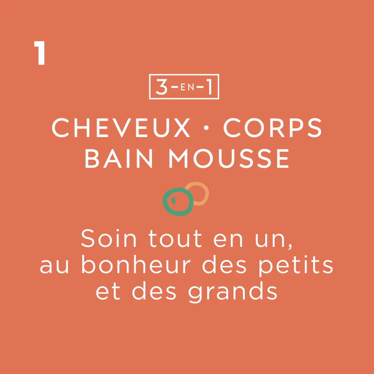 • Pour la douche : Mouillez la chevelure et le corps avec de l’eau tiède. Déposez une petite quantité de 3-en-1 dans les mains, massez légèrement puis rincez.