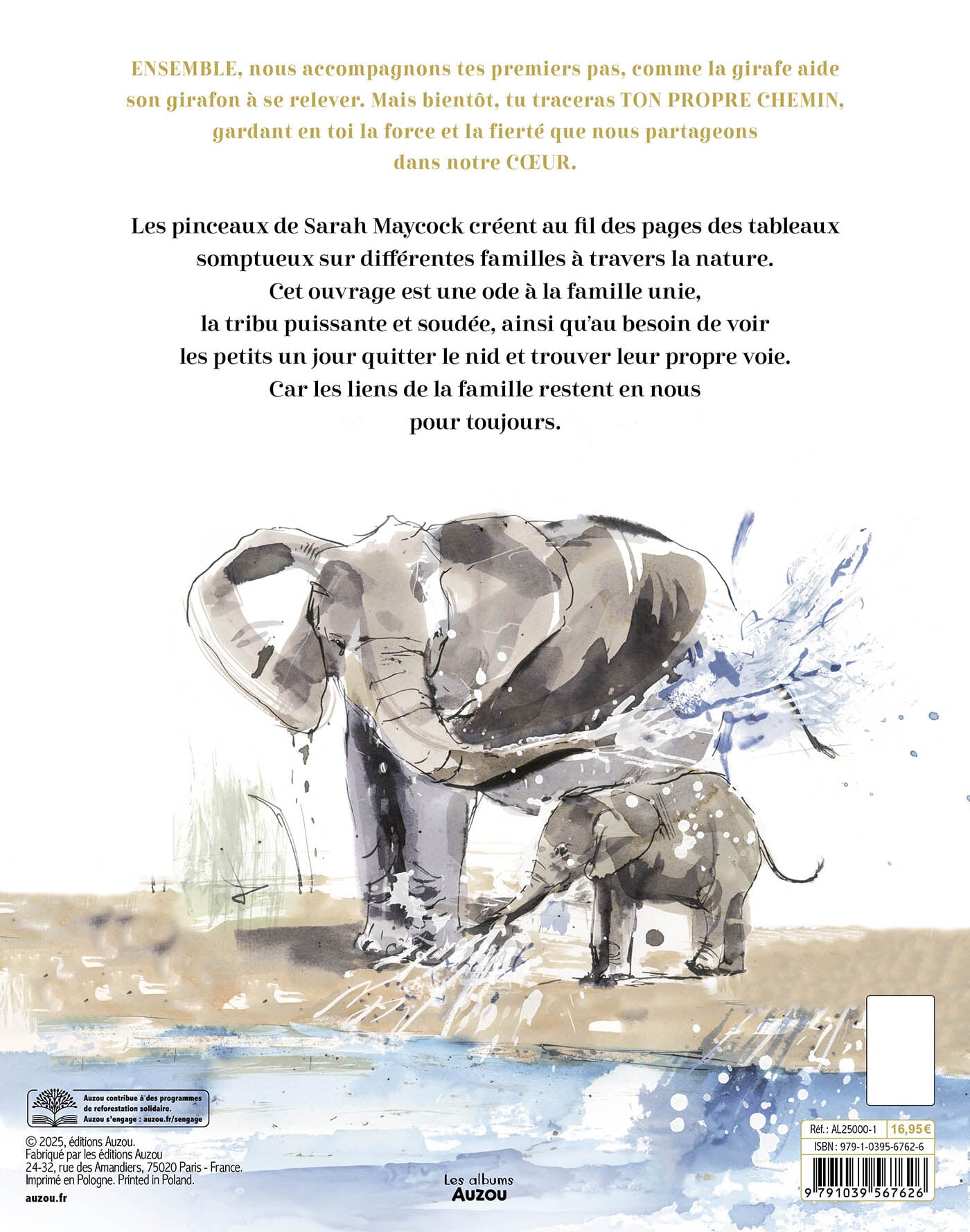 Sous les pinceaux de Sarah Maycock, chaque page devient un tableau vibrant célébrant les familles du monde animal. Cet album rend hommage à la puissance du lien familial : cette tribu soudée qui nous façonne, nous rassemble, et nous apprend à voler de nos propres ailes.